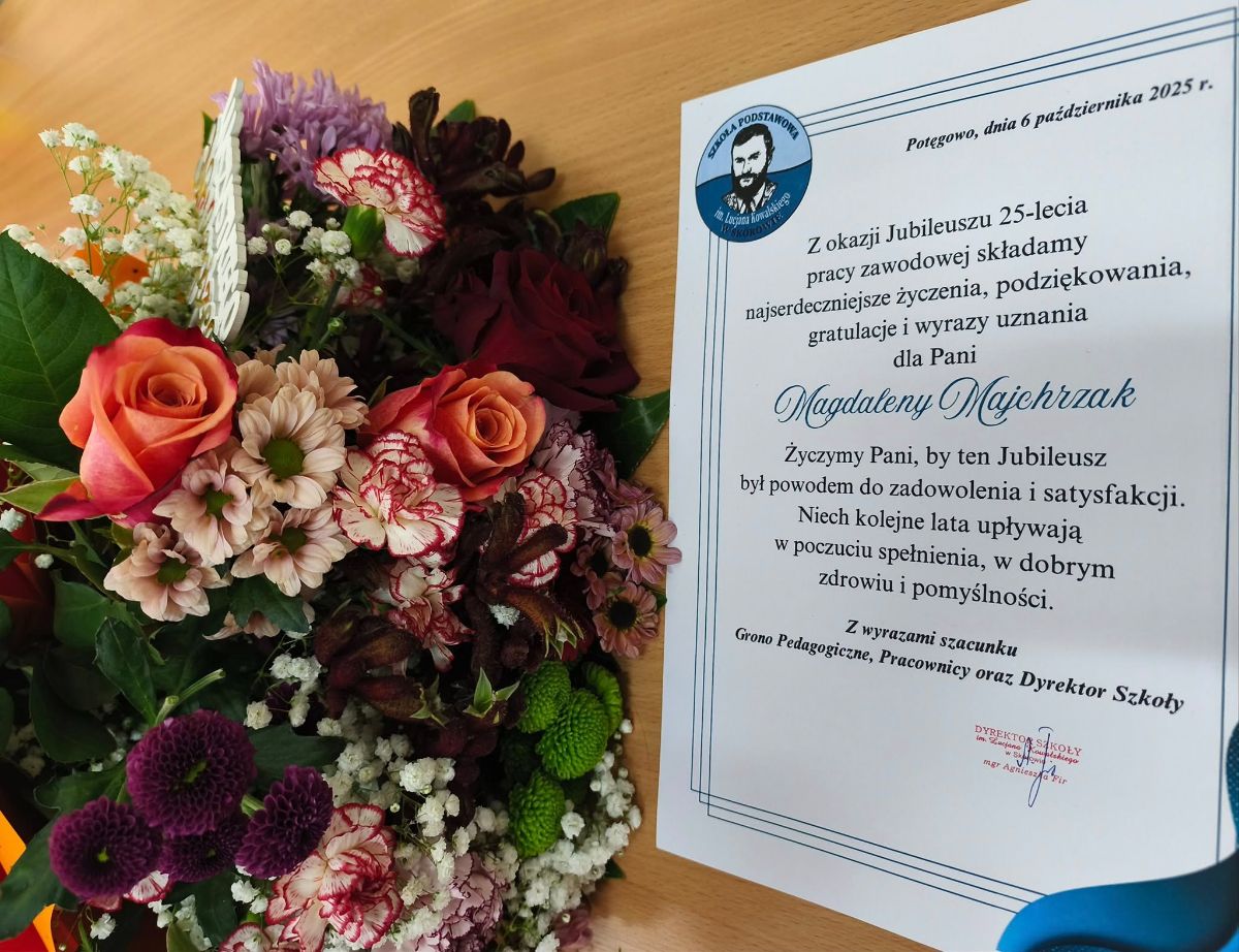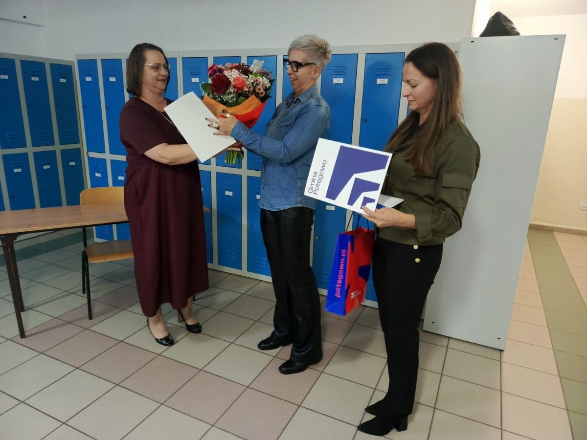 Z okazji 25-lecia pracy Dyrektor Szkoły Agnieszka Fir wręczyła dziś nagrodę jubileuszową pani Magdalenie Majchrzak, nauczycielce języka angielskiego w naszej szkole.