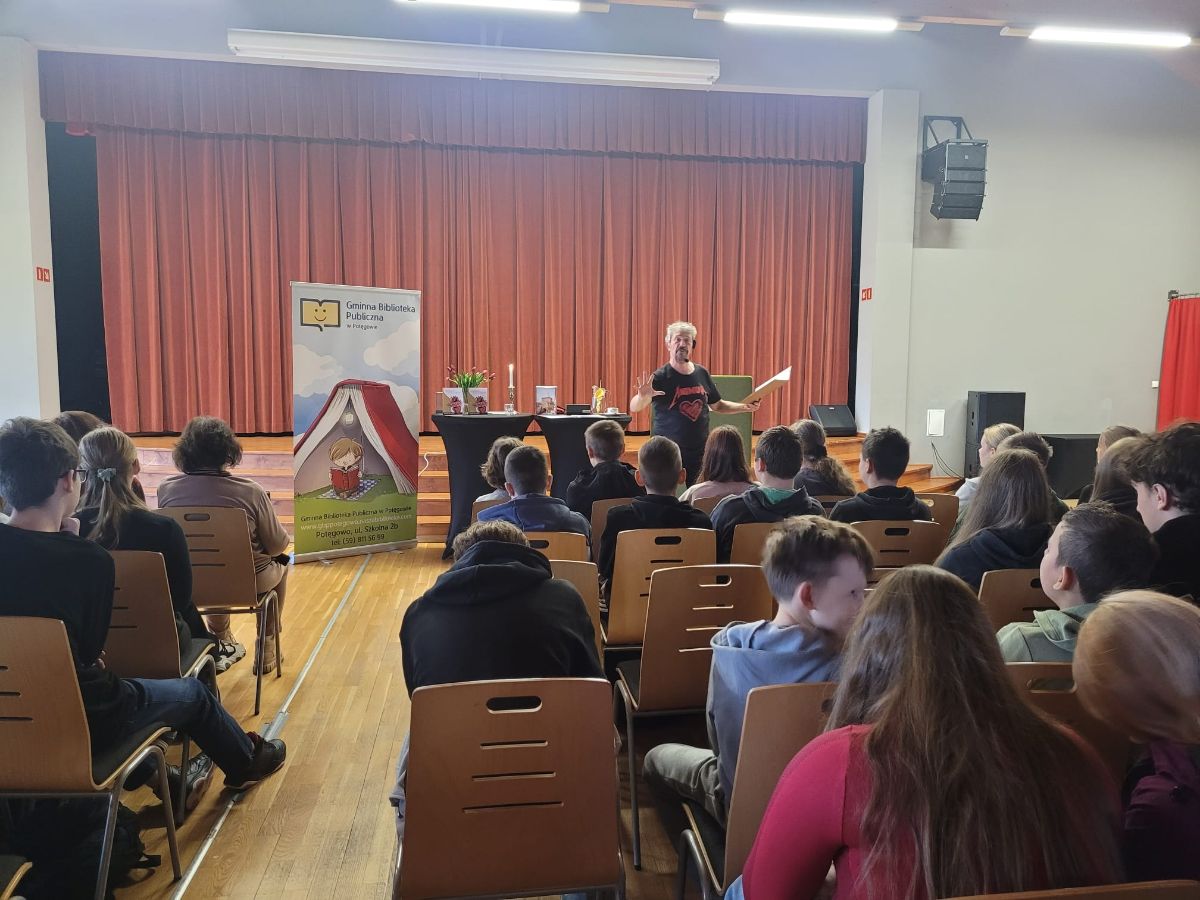 Uczniowie klasy ósmej mieli okazję obejrzeć recital poetycki Piotra Pilarskiego pt. „Animus – serce moje”, który odbył się w Gminnym Ośrodku Kultury w Potęgowie.