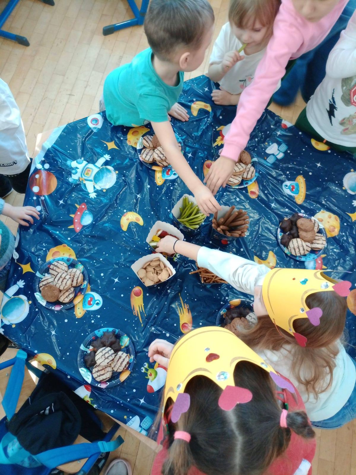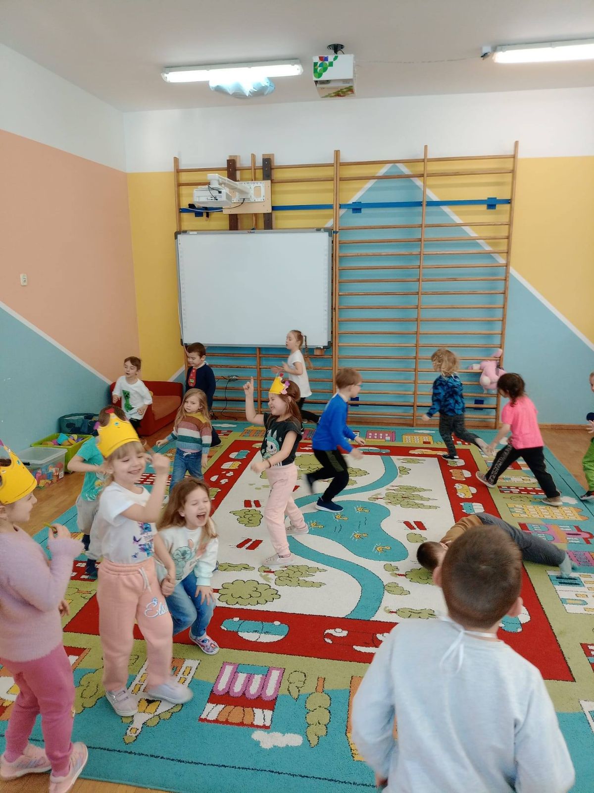 Nie zabrakło słodkiego poczęstunku, który umilił wspólne świętowanie. Dzieci chętnie brały udział w zabawach muzyczno-ruchowych, które dostarczyły wszystkim dużo radości i pozytywnej energii.
