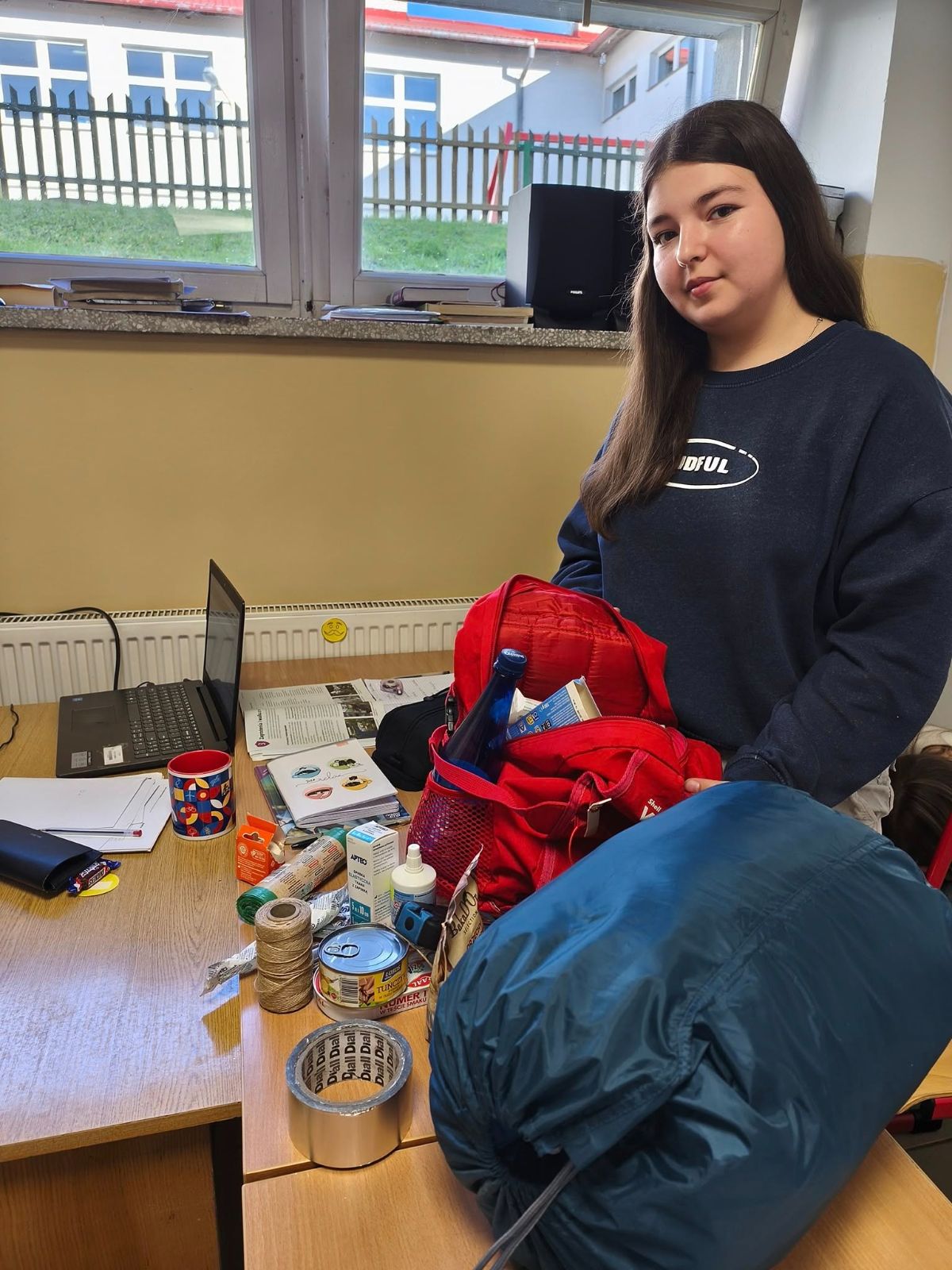 Na zajęciach "Edukacji dla bezpieczeństwa" uczniowie klasy ósmej przygotowali pod okiem p. Anny Jagielskiej swoje plecaki ewakuacyjne.