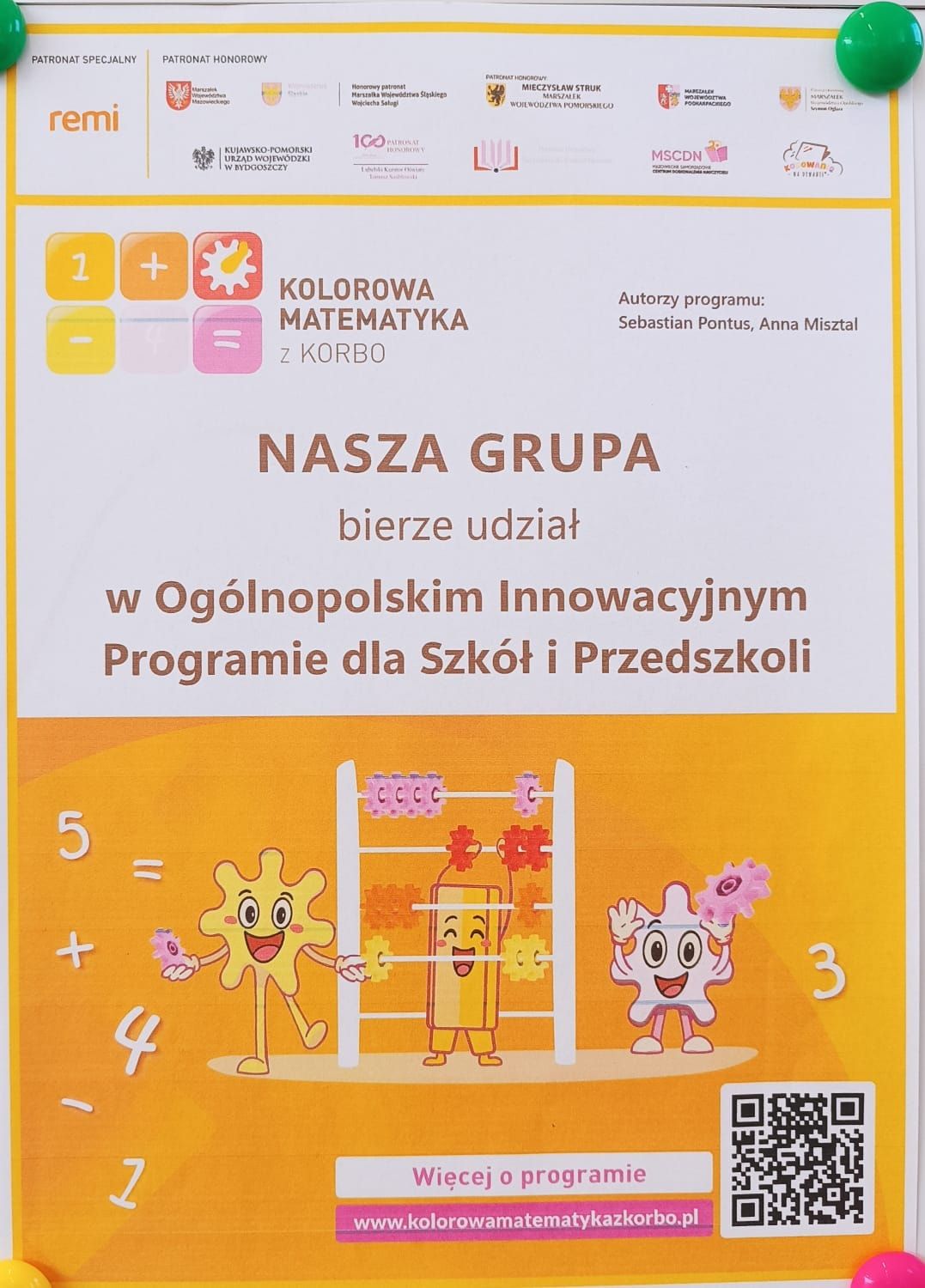 Miło nam poinformować, że grupa 5-6-latków bierze udział w Ogólnopolskim Innowacyjnym Programie dla Szkół i Przedszkoli „KOLOROWA MATEMATYKA z KORBO”