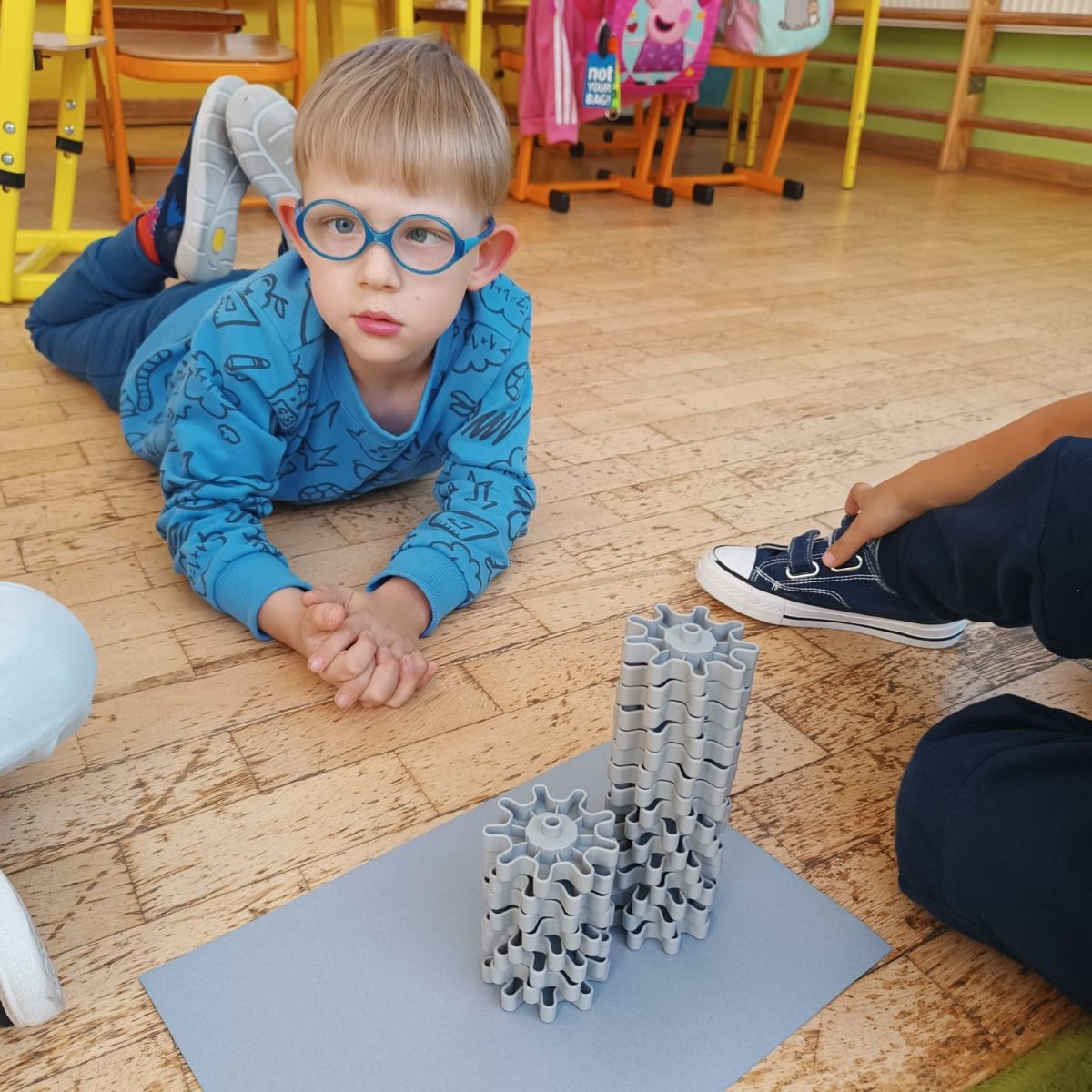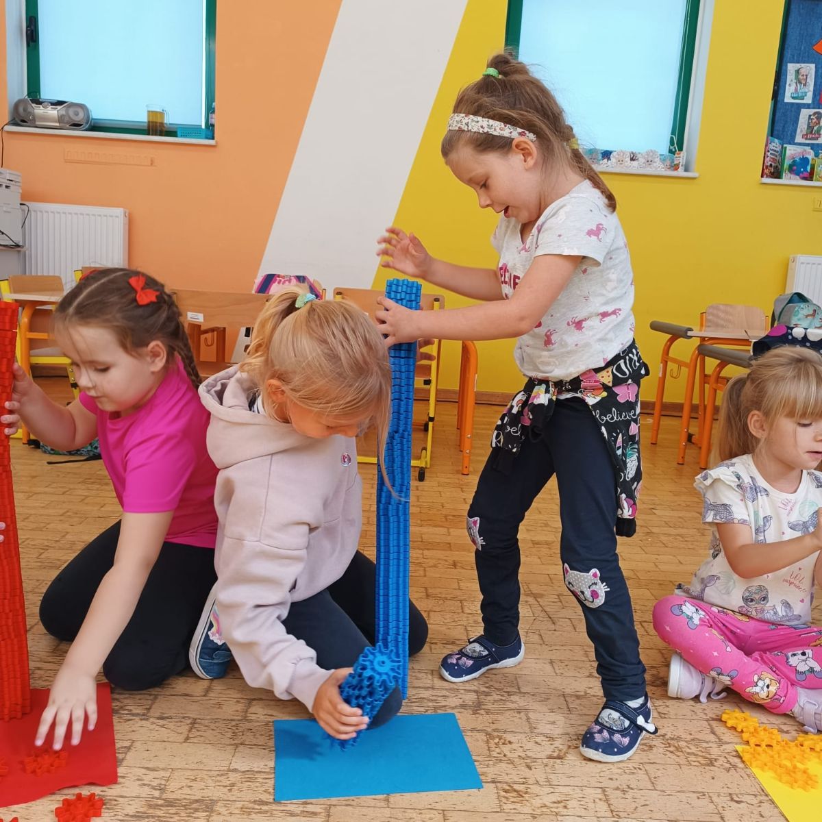 Dzieci wykonały zadanie „Kolorowe wyspy”, pracując w grupach dwu/trzyosobowych. Przyporządkowywały elementy, ustalały nazwy klocków (platforma, zębatka, walec...) oraz rozpoznawały relacje występujace między przedmiotami: większy–mniejszy, dłuższy–krótszy, taki sam–inny.