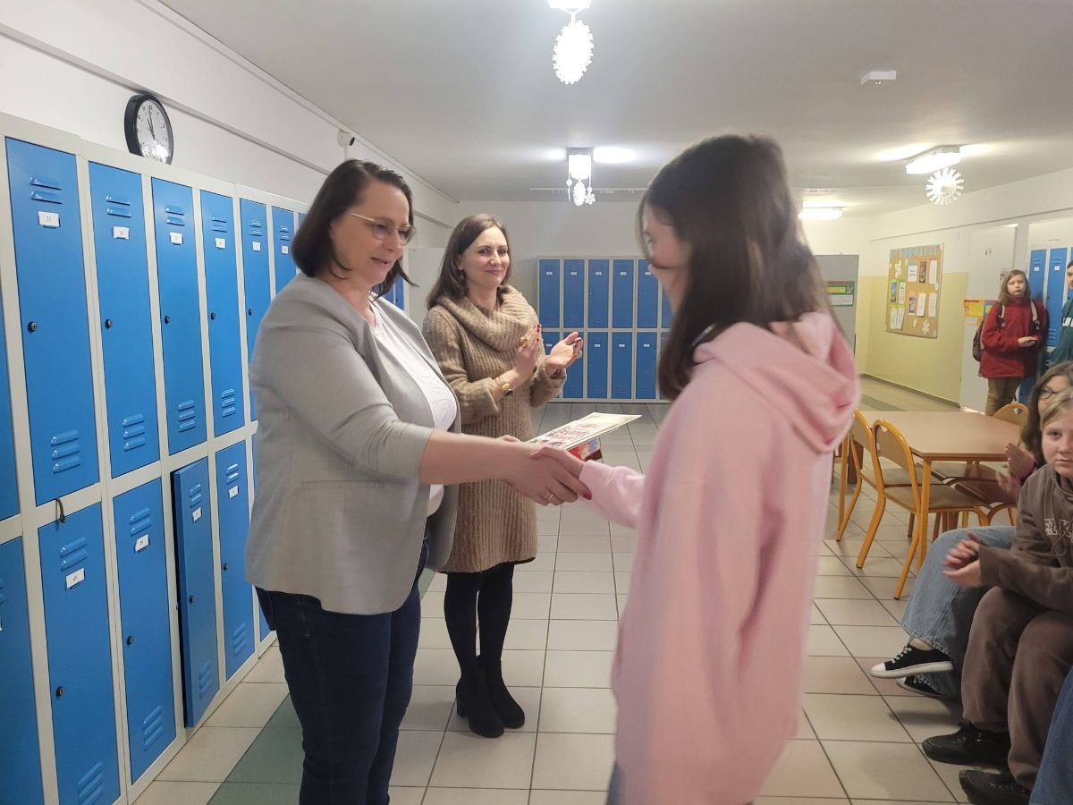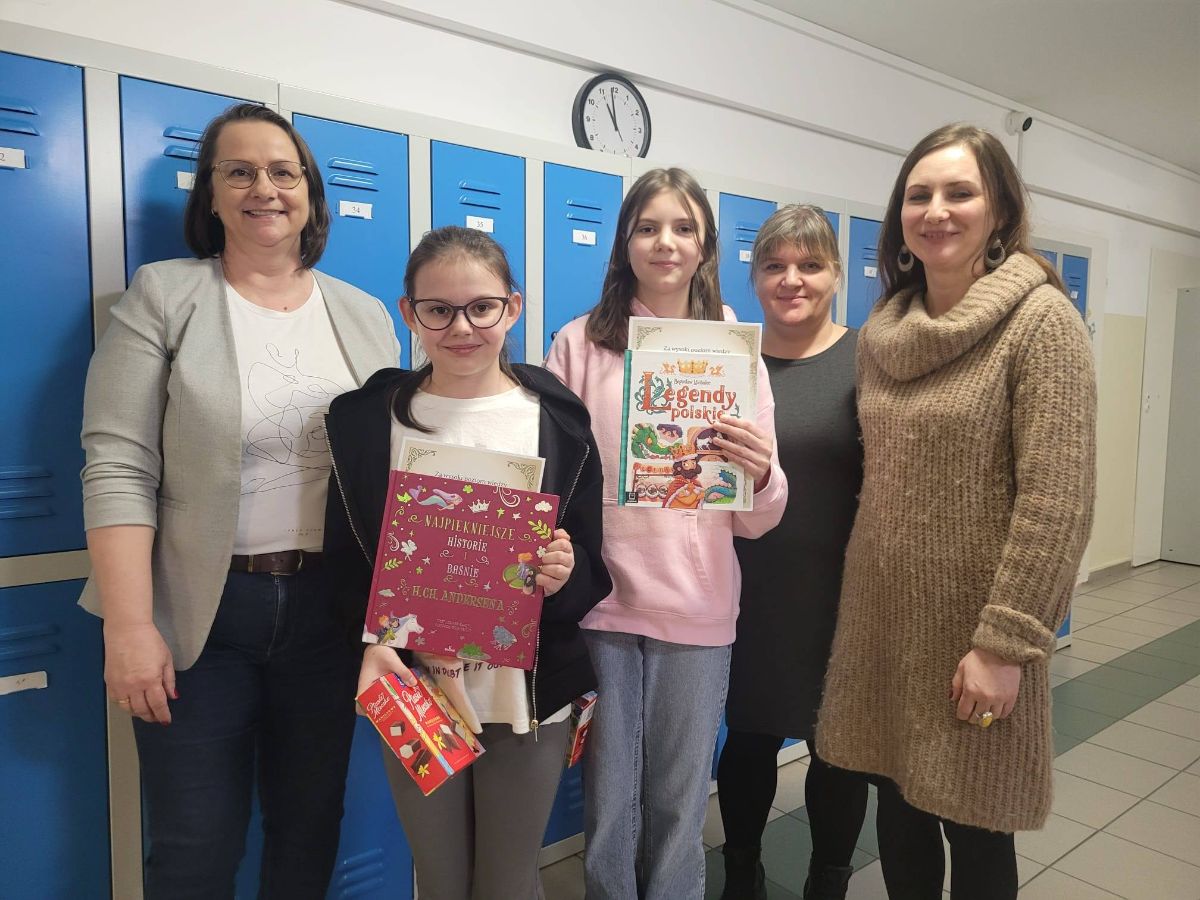 Zwyciężczynie odebrały dyplomy oraz nagrody książkowe z rąk pani dyrektor Agnieszki Fir, która życzyła im dalszych sukcesów. Do gratulacji dołączyły również organizatorki konkursu – pani Justyna Borkowska oraz pani Monika Wódkiewicz.