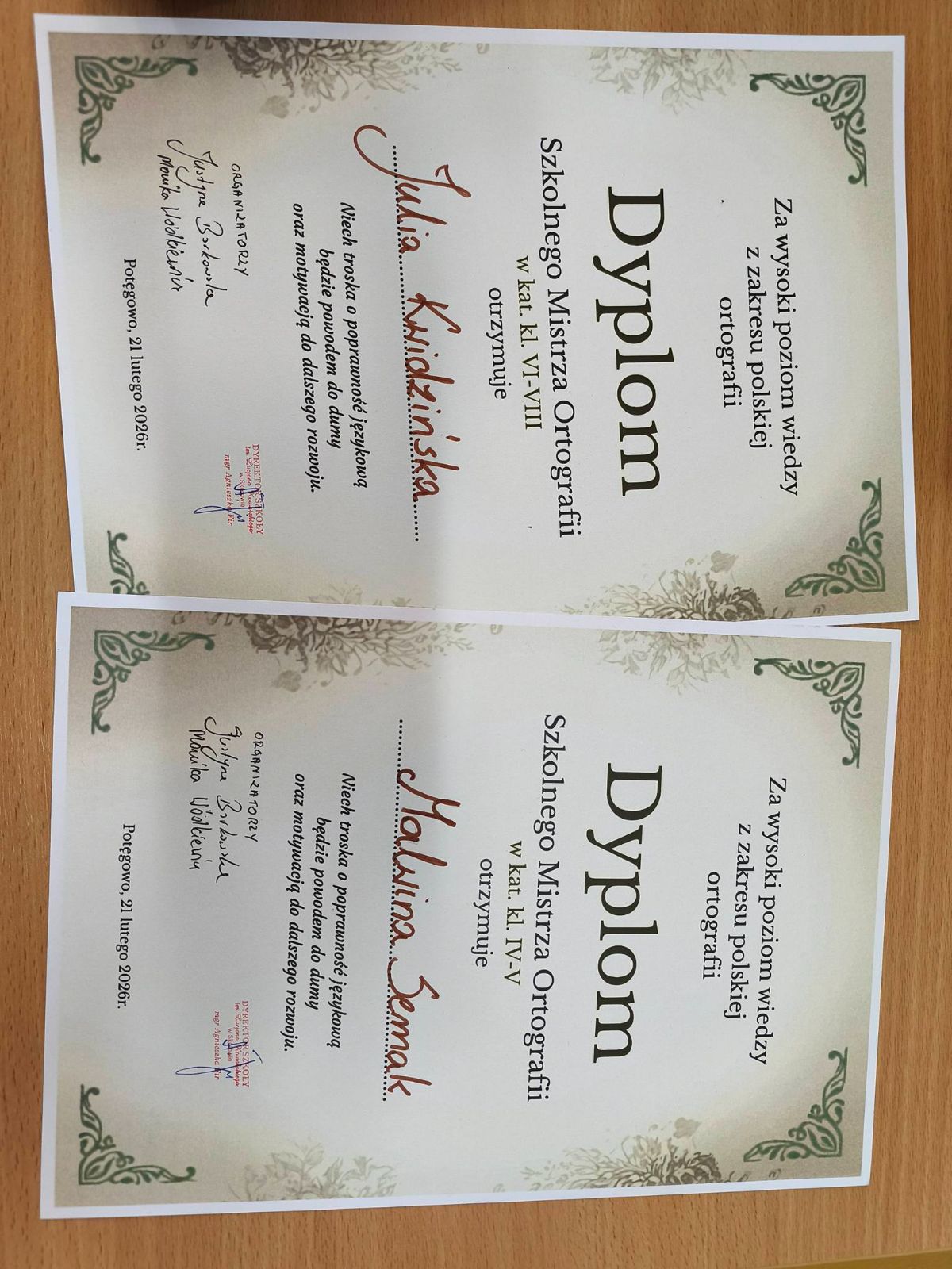 Tytuł Szkolnego Mistrza Ortografii w kategorii klas IV–V zdobyła Malwina Smak, natomiast wśród uczniów klas VI–VIII bezkonkurencyjna okazała się Julia Kwidzińska.