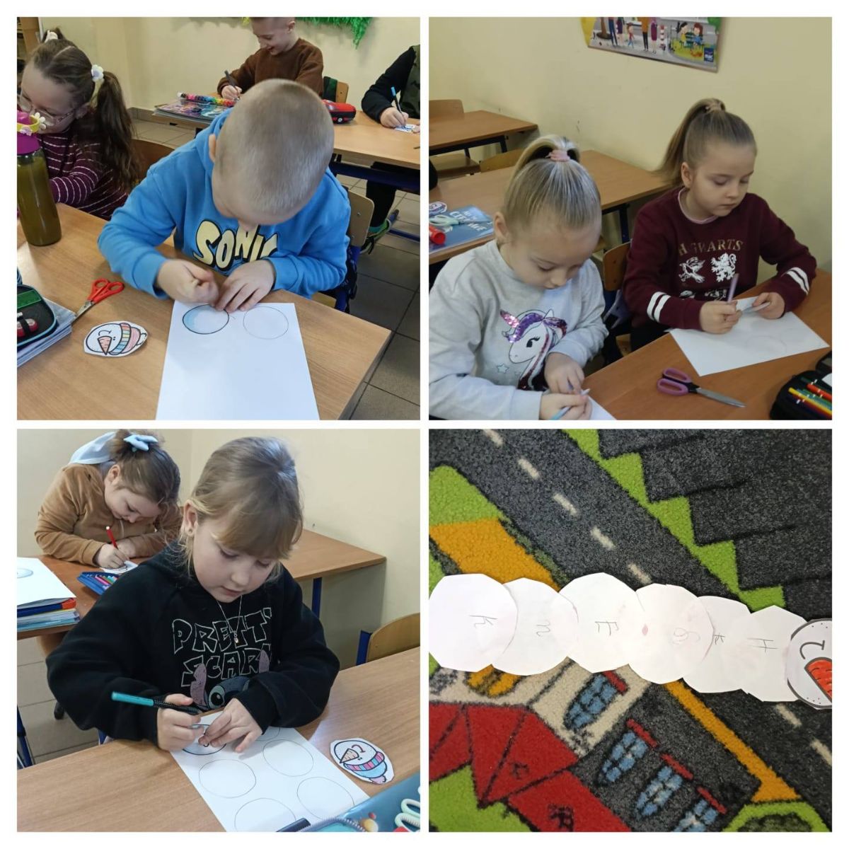 Podczas pracy uczniowie przeliczali elementy, porównywali długość imion, a także rozpoznawali i nazywali figury geometryczne wykorzystane w pracach.