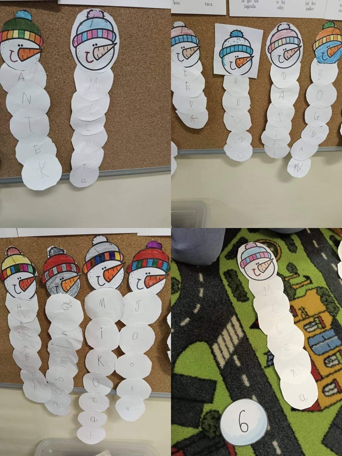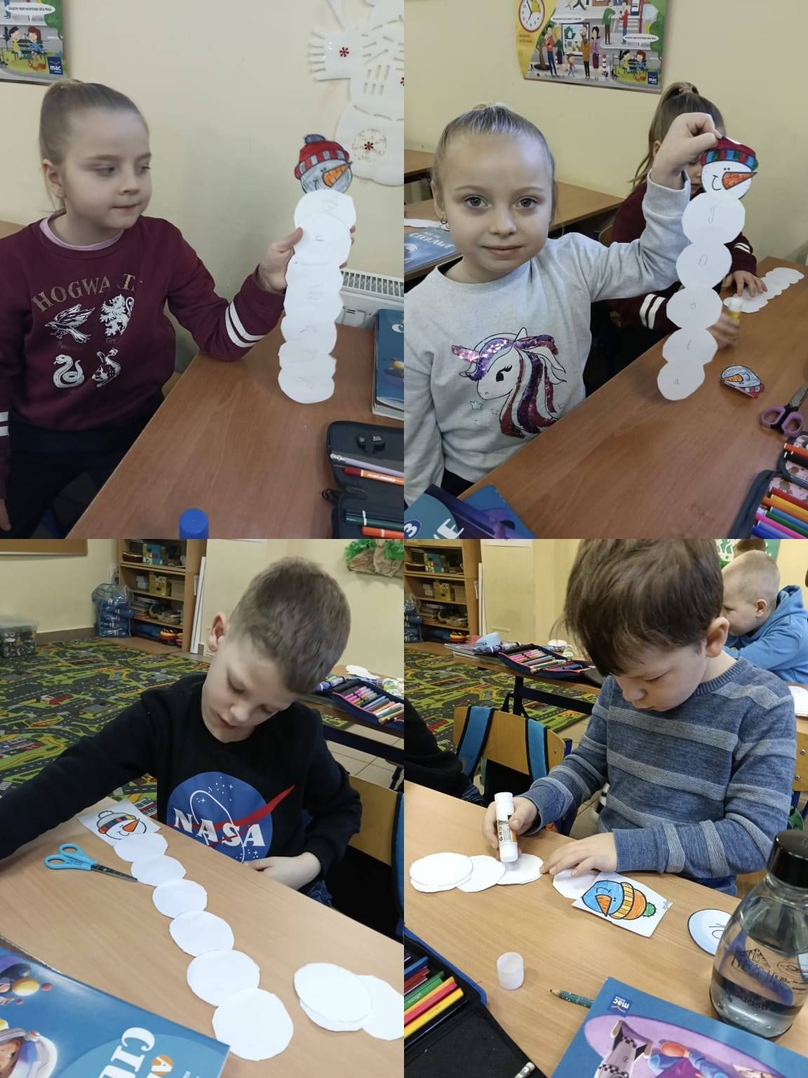 - ,,Zimowa geometria" - w ramach tego działania uczniowie wykonali imienne bałwanki. Każdy bałwanek miał tyle „brzuszków”, ile liter liczy imię ucznia.