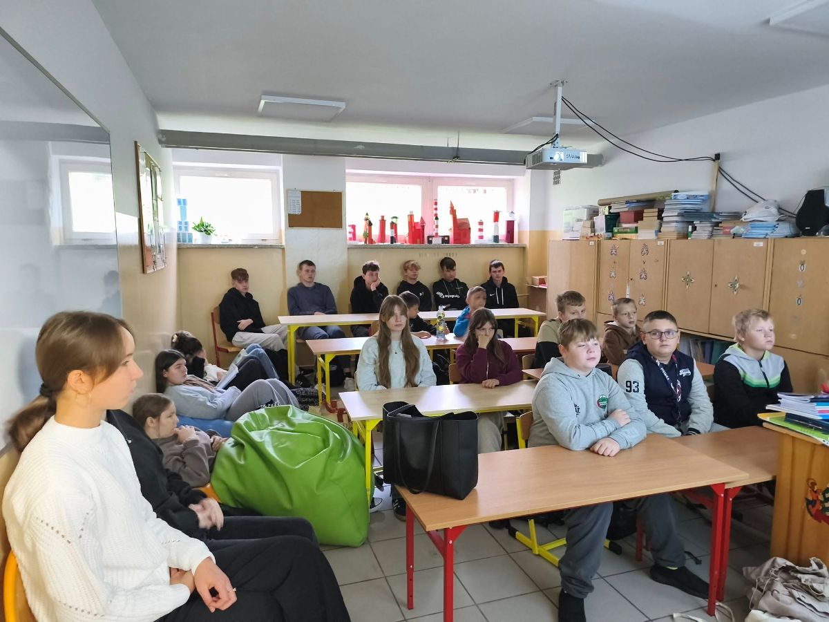 Uczniowie klas 6. i 8. wzięli udział w wyjątkowej lekcji on-line, transmitowanej prosto z Polskiego Pawilonu podczas Expo 2025 w Osace. Gościem tego wydarzenia był polski astronauta dr Sławosz Uznański-Wiśniewski.