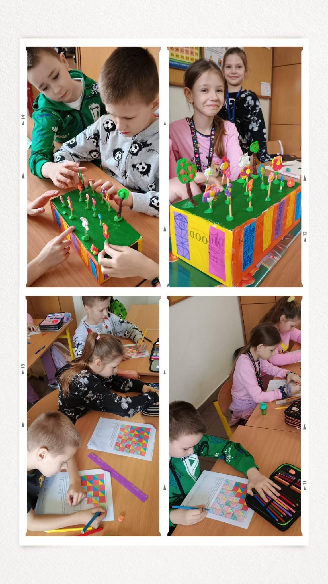 Dzieci mierzyły okna i klasę, proponując zmiany w przestrzeni pomieszczenia. Na szkolnych korytarzach doszukiwały się powtarzalnych wzorów, rytmów i proponowały własny wzór - parkietaż. Spacer ulicami wsi pozwolił na porównywanie wysokości domów, ilości okien, odnajdywanie nietypowych kształtów i elementów symetrycznych. Kto wie, być może zainteresowanie tematem zdecyduje, że w przyszłości któreś z nich wybierze zawód architekta.
