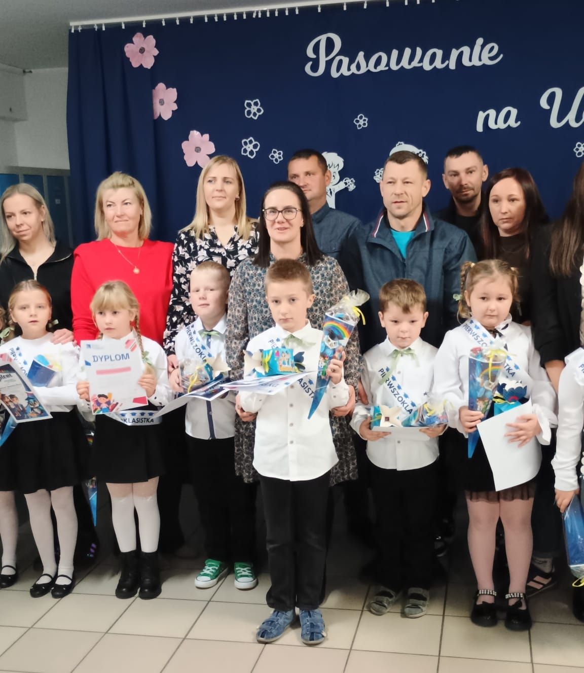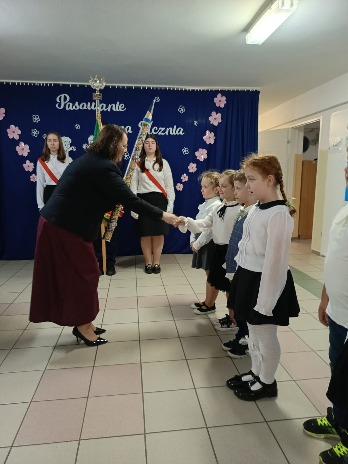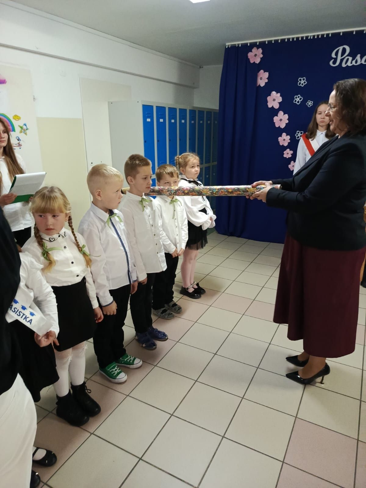 Po pięknych występach artystycznych, przygotowanych pod czujnym okiem wychowawczyni Pani Jolanty Gromowskiej, przyszedł czas na ślubowanie, a następnie pasowanie na ucznia, którego dokonała Pani Dyrektor Agnieszka Fir "zaczarowanym" kolorowym ołówkiem.