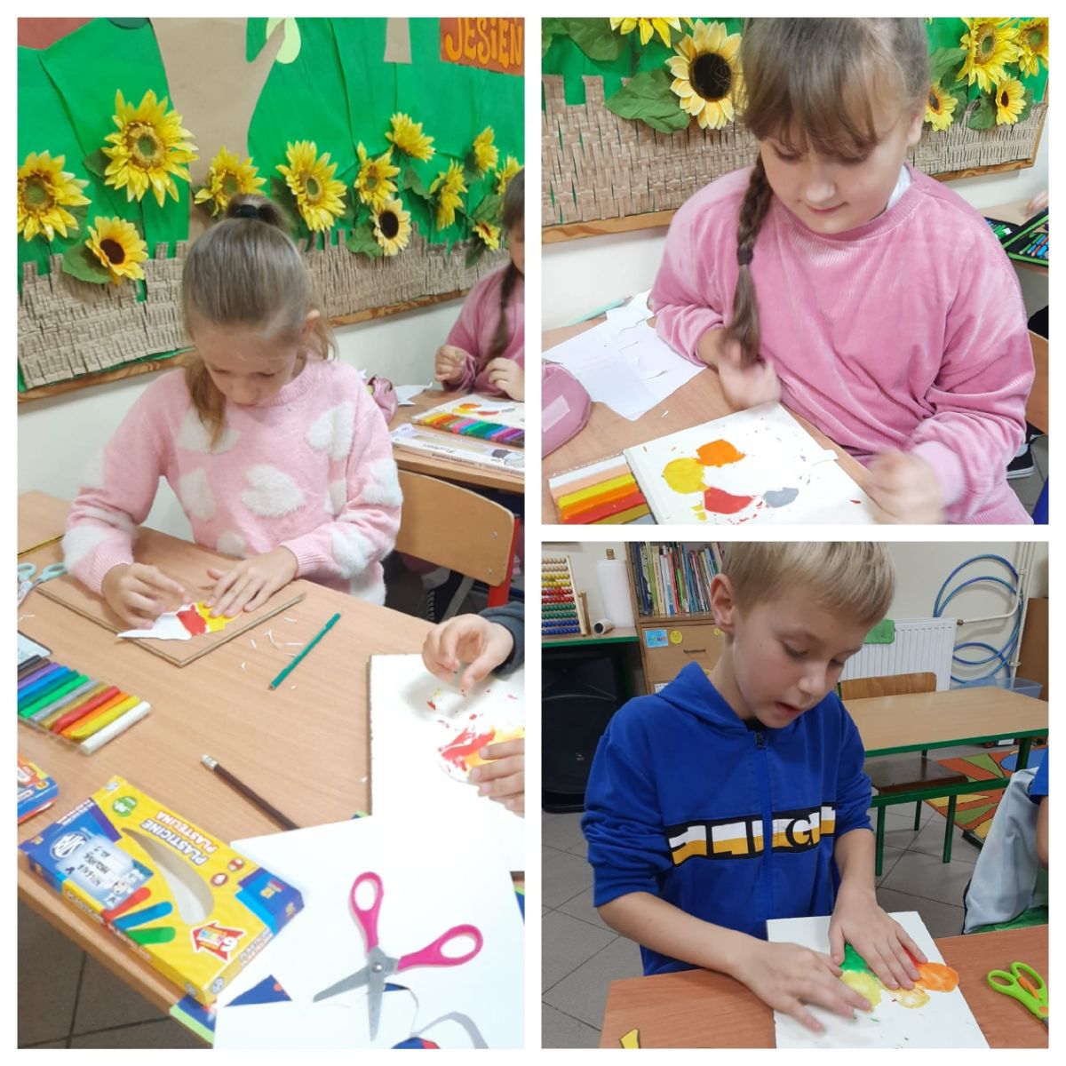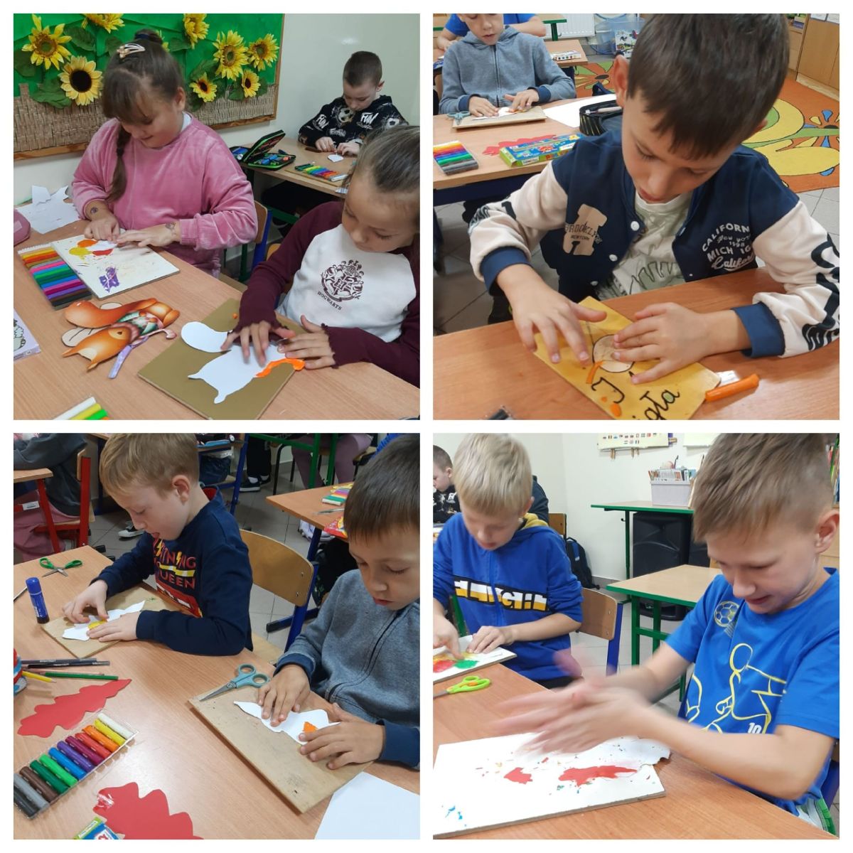 Zajęcia pod hasłem „Szelest barw w dziecięcych dłoniach” wprowadziły uczniów w świat jesiennych barw, ruchu i twórczej aktywności. Dzieci rozwiązywały zagadki o darach jesieni, tańczyły przy muzyce, wykorzystując jesienne liście, układały „buźki” z kasztanów, przeliczały jesienne skarby, a na zakończenie wykonały piękne, kolorowe prace plastyczne.